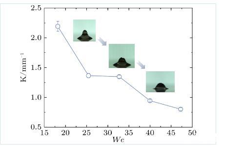 為了更加清晰地表明液滴撞擊的We對三種模態(tài)的影響,根據(jù)實驗結果總結了撞擊We與電毛細力Cae的關系,如圖7所示。函數(shù)結果表明,第一模態(tài)可以發(fā)生在所有韋伯數(shù)內,并且隨著韋伯數(shù)的增加,第一模態(tài)的閾值電場也在不斷增加。第二模態(tài)的閾值電場范圍是三種模態(tài)中最小的,韋伯數(shù)越大時需要更強的電場才能產生第二模態(tài)。第三模態(tài)的閾值電場隨著韋伯數(shù)的增加也在不斷增大,只是液滴出現(xiàn)第三模態(tài)的電場范圍在減小。這可能是由于韋伯數(shù)的變化導致拉伸液滴形態(tài)的變化,從而影響了靜電力的強度?;谏鲜隹紤],為了深入剖析三種模態(tài)閾值電場變化的原因,根據(jù)實驗結果對無外加電場條件下液滴拉伸過程中韋伯數(shù)We與平均頂點曲率K(如式7所示)的關系進行了討論,如圖8所示。從關系圖中可以看出,當液滴處于回縮階段并達到最大拉伸高度時,韋伯數(shù)的增加會伴隨著液滴頂部曲率半徑的增大,而曲率半徑的增大將會導致靜電力的相對減弱。