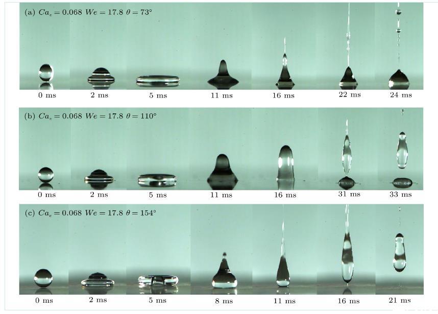 液滴撞擊不同潤濕性壁面后會產生不同的動態(tài)行為,通常采用接觸角反映壁面潤濕性。接觸角越小,表面的潤濕性越好,越親水;接觸角越大,表面的潤濕性越差,越疏水。為了觀察潤濕性對電場作用下液滴撞擊表面的影響,除了研究前文的親水表面,還研究了疏水和超疏水表面。圖9為去離子水液滴在電毛細數(shù)Cae=0.068(E=6.5 kV/cm)下分別撞擊親水、疏水以及超疏水表面的過程圖。特別注意的是,在本實驗中,液滴撞擊疏水表面并未出現(xiàn)回彈現(xiàn)象。通過比較液滴撞擊三個不同接觸角壁面的實驗結果圖可以發(fā)現(xiàn),當液滴處于第三模態(tài)即噴射狀態(tài)時,如圖9(a)16 ms所示,液滴在親水表面上底部呈現(xiàn)錐形并且噴射液柱細長,然而,噴射前液滴在疏水表面上呈現(xiàn)圓頭子彈形(圖9b-16ms),噴射后殘留在表面上的液滴量明顯比親水表面減少,如圖9(b)中33 ms所示。液滴在超疏水表面上噴射模態(tài)與前兩者更不同,如圖9(c)所示。液滴在撞擊后頂部呈噴射狀態(tài),這是由于靜電力所致,同時液滴在不斷地脫離表面,這是由于超疏水表面的特殊結構使得液滴無法在表面附著,與無電場時液滴撞擊超疏水表面不同的是,在液滴反彈過程中底部會產生絲狀液柱,如圖9(c)-16 ms所示。