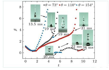 不論接觸角大小如何改變,液滴在場強較大情況下與下極板接觸后,電荷分布到液滴表面,使得液滴頂部出現(xiàn)拉伸及噴射現(xiàn)象。圖10為液滴的拉伸系數(shù)與接觸角的關系。從圖中可以看出,液滴撞擊三種不同表面后,其運動形態(tài)具有相似性,主液滴(與表面接觸的液滴部分)的拉伸系數(shù)均隨著無量綱時間不斷增加,當噴射達到一定時間后會有部分液滴分離,主液滴拉伸系數(shù)驟降,隨后振蕩最終趨于穩(wěn)定。