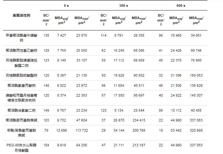表3不同表面活性劑的泡沫在0,300和600 s時(shí)的氣泡面積