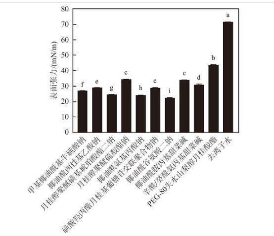 將10種表面活性劑的去離子水溶液(pH=6.0)進(jìn)行表面張力測(cè)定,結(jié)果如圖1所示。去離子水的表面張力為71.81 mN/m;所有表面活性劑均可顯著降低去離子水的表面張力,其中PEG-80失水山梨醇月桂酸酯降低表面張力的能力最差,為43.73 mN/m;月桂醇聚醚硫酸酯鈉和椰油酰胺丙基甜菜堿水溶液的表面張力無(wú)顯著差異,分別為34.14和33.87 mN/m;辛酰/癸酰氨丙基甜菜堿水溶液的表面張力為30.54 mN/m;椰油酰兩性基乙酸鈉和磺酸羥丙酯月桂基葡糖苷交聯(lián)聚合物鈉水溶液的表面張力無(wú)顯著差異,分別為28.88和28.71 mN/m;甲基椰油?;;撬徕c水溶液的表面張力為26.74 mN/m;月桂醇聚醚磺基琥珀酸酯二鈉水溶液的表面張力為24.16 mN/m;椰油酰氨基丙酸鈉水溶液的表面張力較低,為23.84 mN/m;椰油酰谷氨酸二鈉水溶液的表面張力最低,為22.08 mN/m。