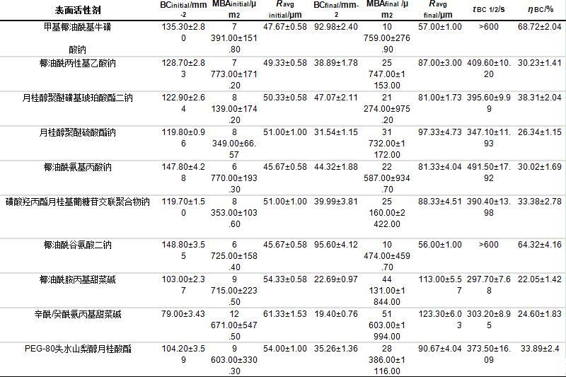 本研究除了測試表面活性劑溶液的表面張力、泡沫形態(tài)、泡沫密度保留率(ηBC)和泡沫體積保留率(ηV)外,還測試了最大泡沫含液量(Vliquid foam max)、析液半衰期(tFLS 50%)、氣泡個(gè)數(shù)半衰期(tBC1/2)、泡沫液體體積比率(MD)等指標(biāo),結(jié)果如表4和表5所示。