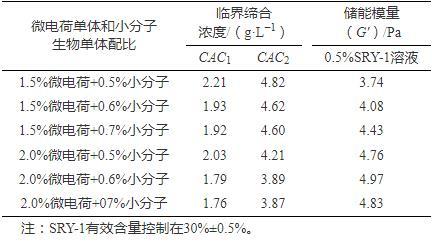 室內(nèi)合成實(shí)驗(yàn)研究發(fā)現(xiàn),微電荷單體對(duì)降低CAC2貢獻(xiàn)較大,用量?jī)?yōu)選為1.5%~2.5%,而小分子生物單體對(duì)降低CAC1貢獻(xiàn)較大,用量?jī)?yōu)選為0.5%~0.7%,兩種單體共同作用下臨界締合濃度降低和黏彈性提高顯著,最優(yōu)結(jié)果見表3??梢姰?dāng)采用2.0%微電荷單體+0.6%小分子生物單體組合時(shí),溶液具有較強(qiáng)的黏彈性,此時(shí)SRY-1的CAC1,CAC2分別為1.79 g·L?1、3.89 g·L?1,對(duì)應(yīng)SRY-1用量接近0.18%、0.4%。