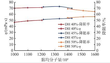 室內(nèi)通過(guò)控制水解度(40%~50%)制備了一系列的SRY-1樣品,配制成濃度為0.5%的溶液,測(cè)試聚合物不同分子量下的表觀黏度(30 min)和降阻率(Q=45 L/min)。如圖2所示,在優(yōu)化的水解度范圍內(nèi),SRY-1分子量均在1000萬(wàn)以上,水解度越高,分子量越高;溶液表觀黏度隨分子量的增大而增大,但降阻率隨分子量的增大呈現(xiàn)先緩慢升高后較快降低的趨勢(shì)。主要是因?yàn)榉肿恿吭礁?,重?fù)單元數(shù)愈多,分子間越易形成鏈纏結(jié),分子鏈具有更大的流體力學(xué)體積,溶液黏度增大,當(dāng)增大到一定范圍,溶液黏彈性受到影響,降阻率就隨之下降。由數(shù)據(jù)對(duì)比,SRY-1分子量控制在1200~1300萬(wàn)為宜。