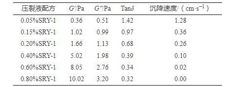測試表明:隨SRY-1濃度的增加,壓裂液彈性模量G′不斷增大,Tanδ不斷減小,并且SRY-1超過CAC1(0.18%)后,增大和減小的趨勢更明顯。從壓裂液微觀作用機(jī)理分析,優(yōu)良的黏彈特性建立在CAC之上,依靠分子鏈間多重共價鍵交聯(lián)作用來形成高強(qiáng)度空間網(wǎng)絡(luò)結(jié)構(gòu),才能在壓裂液懸浮、攜帶支撐劑能力上發(fā)揮獨特優(yōu)勢。為此,進(jìn)一步測試了40/70支撐劑在壓裂液中的沉降速度,結(jié)合壓裂液G′、G″、Tanδ與沉降速度進(jìn)行關(guān)聯(lián)分析,如表5所示。