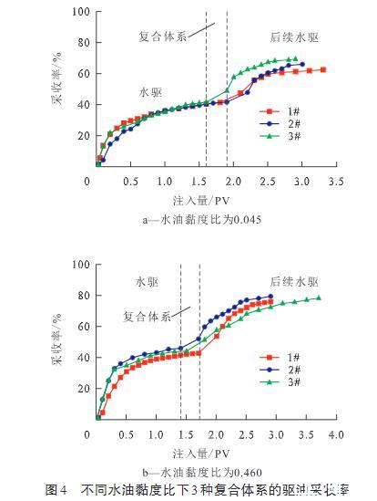 圖4不同水油黏度比下3種復合體系的驅油采收率