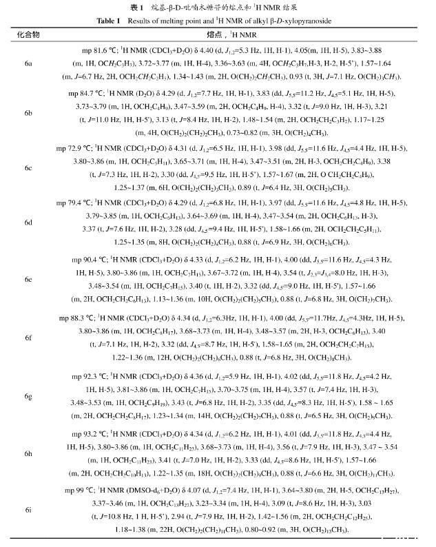 表1烷基-β-D-吡喃木糖苷的熔點(diǎn)和1H NMR結(jié)果