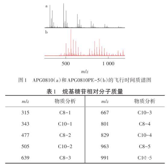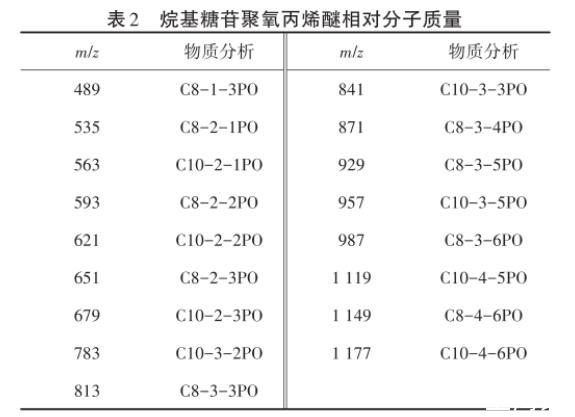 (1)以碳鏈數(shù)8/10、12/14的烷基糖苷(APG0810/APG1214)為原料,通過與環(huán)氧丙烷反應(yīng)得到聚醚產(chǎn)物,并通過TOF質(zhì)譜進(jìn)行結(jié)構(gòu)表征,結(jié)果表明PO基團(tuán)成功引入烷基糖苷中。