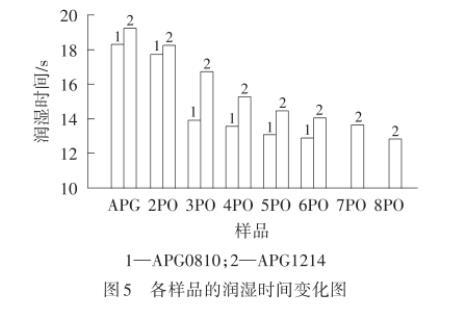 由圖5可以看出,APG0810PE-n和APG1214PEm的潤濕時(shí)間隨著PO加合數(shù)的增加而減少。這是因?yàn)楸砻婊钚詣┰跐駶櫡计瑫r(shí),PO基團(tuán)的引入為分子提供疏水性,提高了分子與帆布片之間的疏水相互作用,促使分子易于吸附在帆布片表面,有利于潤濕。而APG1214和APG1214PE-m的潤濕時(shí)間比APG0810和APG0810PE-n長,說明隨著碳鏈增長,潤濕性能變差,這是因?yàn)榉肿娱L度增加打破了親水親油平衡狀態(tài),不利于潤濕。