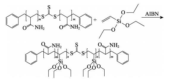 在500 mL四口燒瓶中加入300 g無水乙醇、0.0231 g(0.14 mmol)AIBN和10.0816 g(0.28 mmol)PAM-CTA-4,用超聲波將PAM-CTA-4混合均勻分散,再加入VTES〔其中,n(VTES)∶n(AM)=5∶100、10∶100、15∶100、20∶100〕,在70℃下反應8 h。反應結束后趁熱出料,過濾。在超聲條件下,用正己烷洗滌沉淀,過濾,重復數(shù)次,在45℃真空干燥24 h,得到PAM-b-PVTES固體粉末。將上述不同n(VTES)∶n(AM)制得的產(chǎn)物依次命名為PAM-b-PVTES-1、PAM-b-PVTES-2、PAM-b-PVTES-3、PAM-b-PVTES-4。