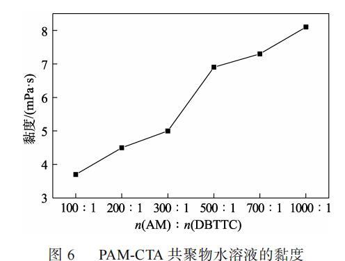 由圖6可知,隨著DBTTC用量的減少,共聚物水溶液黏度緩慢提升,由3.7 mPa·s逐漸升高到8.1 mPa·s,這是因?yàn)?,隨著RAFT試劑用量的減少,共聚物相對(duì)分子質(zhì)量增加,共聚物鏈段增長,共聚物鏈段之間的纏繞作用增強(qiáng),共聚物水溶液黏度升高。適當(dāng)?shù)卣{(diào)節(jié)RAFT試劑的用量可以達(dá)到控制共聚物水溶液黏度的目的。