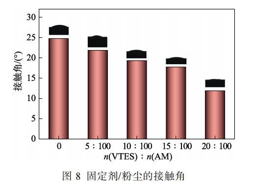 由圖8可知,共聚物水溶液與PTI-A2粉塵的接觸角均<90°,隨著VTES用量的增大,固定劑與PTI-A2粉塵片的接觸角逐漸減小。當(dāng)n(VTES)∶n(AM)由0增加到20∶100時(shí),接觸角從24.8°降低至11.9°,主要是因?yàn)閂TES用量的增加賦予了共聚物水溶液更低的表面張力,而PTI-A2粉塵具有較高的表面張力,因而接觸角越來越小。固定劑與粉塵片的接觸角越小,表明固定劑能更好地潤濕氣溶膠粉塵顆粒,在空氣中固定劑與氣溶膠粉塵顆粒能更好地粘附。
