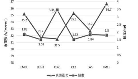 查閱大量文獻發(fā)現(xiàn),大多數(shù)表面活性劑溶液在質(zhì)量分數(shù)達到5%時,其表面張力變化程度保持在穩(wěn)定的數(shù)值。因此本文對表面活性劑溶液按質(zhì)量分數(shù)為5%進行實驗研究,實驗結(jié)果如圖2所示。