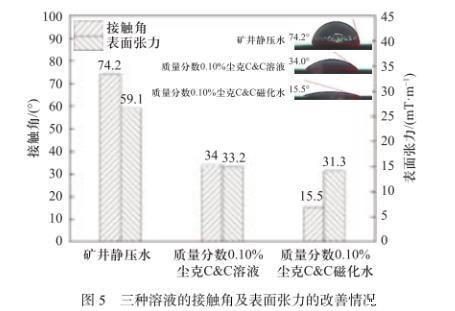 質(zhì)量分?jǐn)?shù)0.10%塵克C&C溶液的表面張力為33.2 mN/m.相較于礦井靜壓水,其表面張力減小了43.82%.質(zhì)量分?jǐn)?shù)0.10%塵克C&C磁化水的表面張力為31.3 mN/m.相較于礦井靜壓水,其接觸角減小了47.04%.由此可以看出,塵克C&C試劑和磁化相結(jié)合可更好地降低溶液的氣~液界面張力,使得溶液與低水分無(wú)煙煤顆粒接觸時(shí),更容易排出固~氣~液三相界面的氣體,以減弱其濕潤(rùn)阻力。