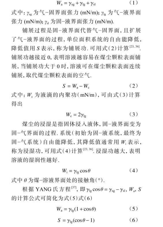 鋪展過(guò)程是固~液界面代替氣~固界面,且擴(kuò)展了氣~液界面的過(guò)程,單位面積系統(tǒng)的自由能降低,降低值用S表示,稱為鋪展功??捎檬剑?)計(jì)算。鋪展功越接近0,表明溶液越容易在煤塵顆粒表面鋪展,當(dāng)鋪展功大于0時(shí),溶液可在煤塵顆粒表面連續(xù)鋪展,取代煤塵顆粒表面的空氣。