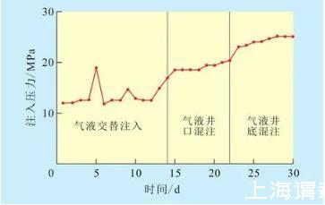 在氣液井口混合注入階段,當(dāng)氣液比為0.5∶1時,注入壓力由氣液交替注入階段末期的17 MPa上升到18.5 MPa;當(dāng)氣液比升至0.75∶1時,注入壓力逐漸升至20.3 MPa。
