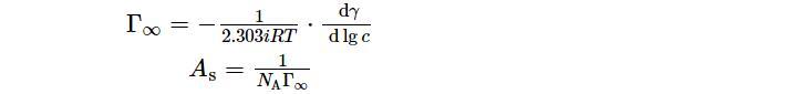 為了更全面地研究表面活性劑溶液性質(zhì),采用Gibbs吸附公式建立了表面吸附量和表面張力及活度之間的關(guān)系,根據(jù)表面活性劑表面張力變化曲線,可利用其得出表面飽和吸附量(?!蓿捎诒砻婊钚詣┤芤簼舛群苄?,趨近于稀溶液,其活度可約等于濃度。再通過與阿伏伽德羅常數(shù)的數(shù)量關(guān)系,計(jì)算每個(gè)吸附分子在溶液表面所占的平均面積(AS)。因此可由如下公式計(jì)算: