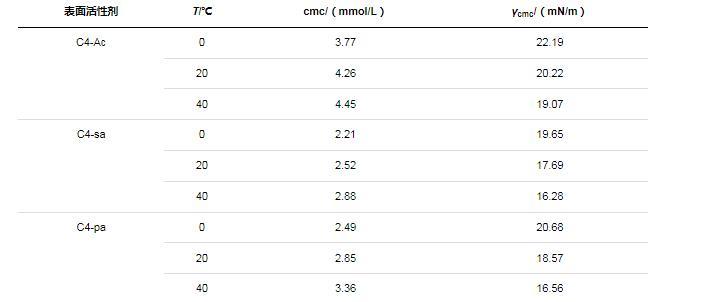 總體而言,溫度對(duì)甜菜堿氟碳表面活性劑的cmc影響較小。此外,在0~40℃的溫度范圍內(nèi),對(duì)比三種表面活性劑的表面活性參數(shù)可知,cmc值均小于4.45 mmol/L,γcmc均小于22.19 mN/m。親水端官能團(tuán)的不同對(duì)表面活性劑的性能具有一定的影響,當(dāng)溶液濃度足夠大時(shí),C4-Ac的表面張力相對(duì)較高,C4-sa和C4-pa具有較低的表面張力,后者略高于前者,并且C4-sa和C4-pa的cmc值低于C4-Ac。因?yàn)閺姆肿咏Y(jié)構(gòu)上來看,C4-Ac比C4-sa和C4-pa少一個(gè)有效碳,因此前者的疏水性要略弱于后二者,可以解釋表面張力和cmc的相對(duì)大小。