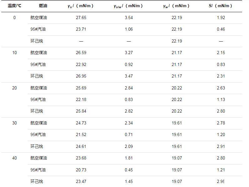 式中,S為鋪展系數(shù);γo為燃油的表面張力,mN/m;γw為表面活性劑溶液的表面張力,mN/m;γo/w為燃油與表面活性劑溶液之間的界面張力,mN/m。