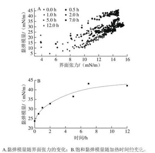 乳液的形成及穩(wěn)定性決定于界面物質的吸附行為和界面膜的黏彈模量。采用懸滴法對β-乳球蛋白纖維化轉變過程中不同階段產(chǎn)物的界面吸附動力學過程和界面膜的黏彈模量進行研究。圖3A為各階段產(chǎn)物在油-水界面的界面張力隨時間的變化??梢杂^察到,所有樣品的界面張力隨吸附時間逐漸上升,意味著不同階段產(chǎn)物均具有界面吸附行為。一段時間后界面張力上升速度趨于平緩,表明物質在界面上的吸附逐漸達到飽和。從圖3B可以發(fā)現(xiàn),纖維化轉變不同階段的產(chǎn)物,其平衡界面張力存在區(qū)別。在開始階段,飽和界面張力隨蛋白加熱時間的延長而升高,當加熱時間超過2 h后,飽和界面張力的變化不再明顯。綜合上述分析可以看出,在熱處理的初始階段,蛋白質發(fā)生了水解,這一現(xiàn)象使得蛋白質分子質量變小,而擴散速度增加,因而相對未水解的蛋白能達到更高的飽和界面張力。盡管過度水解會導致蛋白質界面活性的破壞,但后期隨著納米纖維的形成,混合體系的整體界面活性仍然能保持較高水平。