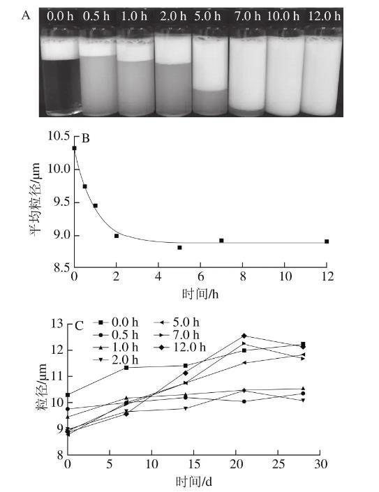 圖5纖維化轉變過程中β-乳球蛋白納米纖維穩(wěn)定的乳液外觀(A)、平均粒徑(B)和常溫貯藏時粒徑(C)的變化