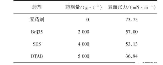 在浮選精煤過濾階段,濾餅中存在較強的毛細作用,水分難以排出。降低液相的表面張力可從根本上降低毛細力,使大量的毛細水從煤粒的間隙中排出。試驗對不加藥及3種藥劑最佳用量時濾液的表面張力進行測定,結(jié)果見表6。從表6可以看出,在不加藥時濾液的表面張力最高,為73.75 mN/m,比水的表面張力72.75 mN/m略高,其原因可能是浮選精煤表面殘留的浮選藥劑進入了濾液。在添加了表面活性劑后,3個濾液樣品的表面張力均有不同程度的下降。其中,添加Brij35的濾液表面張力較高,為57.00 mN/m,添加了SDS的濾液表面張力略低于Brij35,為53.13 mN/m,而添加了DTAB的濾液表面張力最低,僅為36.94 mN/m。表面張力的降低可顯著促進煤顆粒間毛細水的脫除。