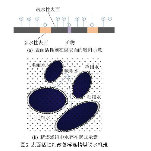 表面活性劑在煤表面的吸附可由圖5a解釋,親水基團主要與煤表面礦物質(zhì)或煤親水性表面發(fā)生吸附,疏水基團主要與煤表面疏水位點發(fā)生吸附。由于本次研究煤樣為煉焦煤精煤,其表面以疏水為主,這導致大部分表面活性劑的疏水基團與煤表面疏水區(qū)域發(fā)生吸附,使得表面活性劑親水基團暴露在外,因此煤表面親水性增加。煤表面親水性增加雖然會使煤表面水化膜變厚,吸附水能力增加,但該作用與表面活性劑促進毛細水的脫出效應相比較小(圖5b)。因此,表面活性劑的存在雖使煤表面親水性上升,但使水的表面張力大幅降低,從而使煤粒間隙中的毛細水更容易在壓力的作用下排出,因此表面活性劑在此研究中降低了精煤濾餅中的水分。
