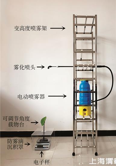 流失點和最大穩(wěn)定持留量的測定裝置見圖2。將噴霧器固定在可變高度噴霧架上,噴頭與地面垂直,分別設置噴嘴下沿與葉片中心垂直距離50、100、150和200 cm 4種噴霧距離,噴霧器中裝入水,進行噴霧時關(guān)閉靜電功能。測定裝置由載物臺、電子秤和防霧滴沉積罩3部分組成。其中載物臺可進行90°以內(nèi)的傾斜角度調(diào)整;電子秤精度為0.01 g(YH-50002型,東陽市英衡智能設備有限公司);防護罩為透明的亞克力材料制成,防止霧滴沉積到電子秤上。