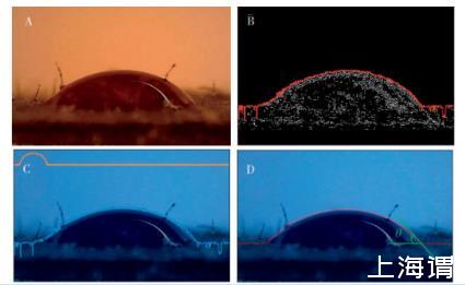 A.顯微鏡拍攝的葉面測試液滴B.用Canny算法進行邊緣檢測(紅色線為提取的輪廓曲線)C.輪廓擬合(黃色線為去除干擾后的輪廓曲線)D.確定并測定接觸角(紅色線為優(yōu)化后的輪廓曲線,右側(cè)兩條綠色線的夾角即為接觸角θ)。放大倍數(shù)為1 000倍