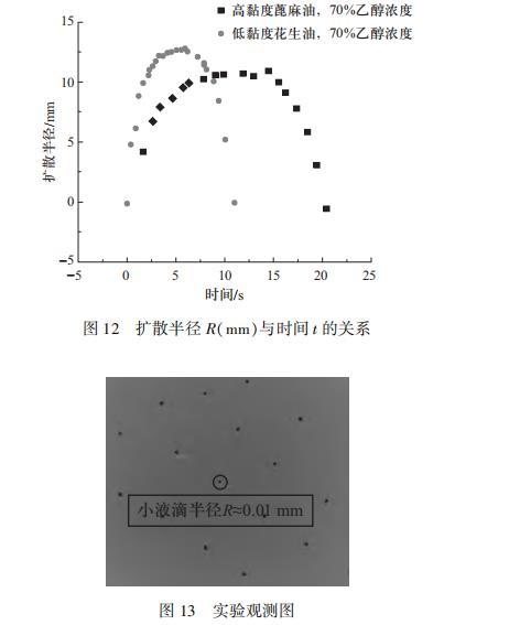 故本文將選擇不同黏度梯度的疏水性物質(zhì)進(jìn)行實(shí)驗(yàn)。采用蓖麻油和花生油進(jìn)行試驗(yàn),蓖麻油的黏度(1452.91 mm2/s)遠(yuǎn)大于花生油(108.34 mm2/s),當(dāng)乙醇濃度為70%時(shí),在蓖麻油上最終液滴的半徑接近0.01 mm,遠(yuǎn)小于對應(yīng)花生油的測量值0.0743 mm.分析實(shí)驗(yàn)數(shù)據(jù)得到結(jié)論:微觀上黏度增大會(huì)導(dǎo)致最終形成的液滴減小,宏觀上黏度越大,液滴爆炸總時(shí)間越長,最大擴(kuò)散半徑越小。