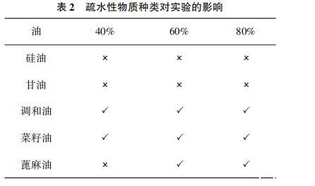 表2疏水性物質(zhì)種類對實(shí)驗(yàn)的影響