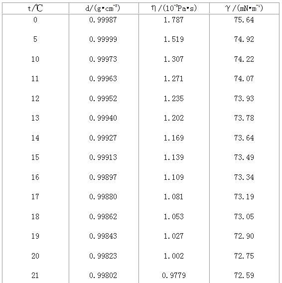 不同溫度時水的密度、粘度及與空氣界面上的表面張力