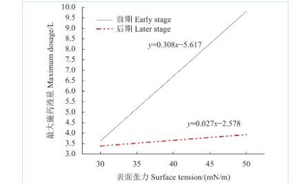 圖8為估算出的蘋果樹葉片分別在生長前期和后期施藥的最大藥液量與藥液表面張力的關(guān)系。從中可以看出,在試驗果園中,在蘋果樹生長前期施藥的最大施用量受藥液表面張力的影響大于在生長后期施藥。