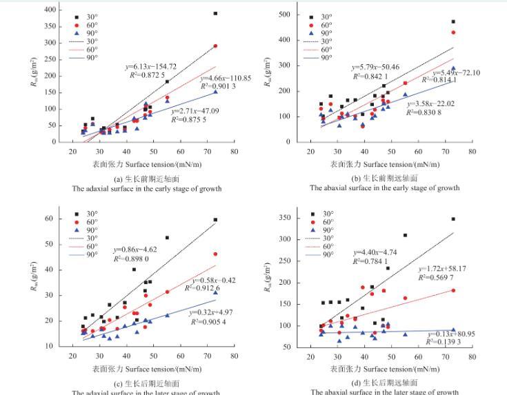 由表2結(jié)果可知,蘋果葉片生長前期近、遠(yuǎn)軸面和生長后期近軸面,不同葉傾角下表面張力與Rm值擬合曲線的R2均高于0.80。而蘋果葉片生長后期遠(yuǎn)軸面除30°時R2高于0.7外,其他葉傾角下均低于0.6,且隨著葉傾角增大,R2不斷減小,這表明蘋果葉片生長后期遠(yuǎn)軸面的表面張力與Rm值之間的線性關(guān)系較差。