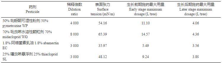 表3為4種常用農(nóng)藥制劑在推薦使用倍數(shù)下對蘋果樹的最大施藥量。從表中可以看出,在蘋果樹生長前期施藥的最大用量遠(yuǎn)高于在生長后期施藥??紤]到目前果園中使用的大容量噴霧器械多為手持柱塞泵式機動噴霧機,霧滴粒徑均一性較差,加之人為因素可能導(dǎo)致的藥液無法均勻覆蓋全樹,再結(jié)合張鵬九等在關(guān)于不同藥械防治蘋果園桃小食心蟲影響的研究中每株樹推薦使用藥液量為3.5 L,得出在果樹前期推薦藥液的表面張力應(yīng)在35 mN/m以下,后期應(yīng)在60 mN/m以上,便于實際操作。