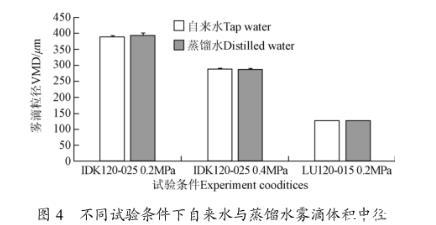 圖4不同試驗條件下自來水與蒸餾水霧滴體積中徑