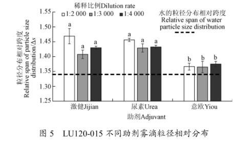 圖5 LU120-015不同助劑霧滴粒徑相對分布