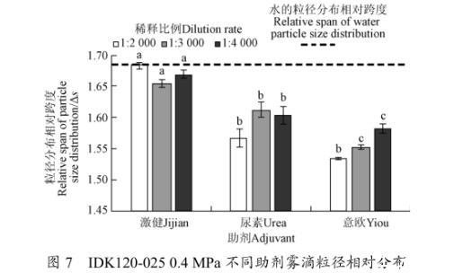 3)IDK120-025型噴頭,0.4 MPa壓力下。激健在配比1:3 000條件下,相比于自來水霧滴體積中徑增大20.43%,霧滴粒徑相對分布跨度減小1.74%。尿素與意歐溶液在配比1:2 000條件下,相比于自來水霧滴體積中徑分別增大16.92%、11.10%,霧滴粒徑相對分布跨度分別減小6.92%、8.86%,在增大霧滴體積中徑的同時有效改善霧滴分布質(zhì)量,增大霧滴飄移可控性。