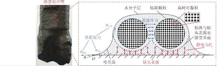 式(1)表明,包裹鉆渣顆粒的“水膜”與鉆頭表面“水膜”形成的整體受彎月面處界面張力作用,被不斷沿鉆頭表面方向“拉扯”,使鉆渣顆粒被界面張力“綁縛”于鉆頭表面(圖3)。但僅依靠界面張力顯然無法抵抗鉆具高速旋轉(zhuǎn)產(chǎn)生的離心力,靜電力與界面張力的共同作用導致了泥化鉆渣黏附于鉆具表面,且靜電力對液渣混合物的黏附發(fā)揮了重要作用。