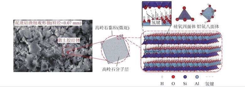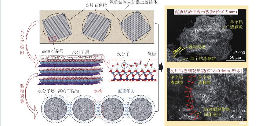 圖2中,在微觀尺度層面,由于高嶺石形成過程中發(fā)生同晶置換,使晶層表面帶永久負電荷。當高嶺石黏粒遇水時,水分子的偶極性使氫原子易與高嶺石晶層表面電負性較強的氧原子結(jié)合形成氫鍵,同時,吸附在晶層表面的水分子之間也會通過氫鍵連接,該過程即為水分子的吸附過程。當?shù)?層水分子被高嶺石黏粒吸附后,其外側(cè)氧原子呈負電性,繼續(xù)與第2層水分子的氫原子以氫鍵形式結(jié)合,最終形成多層水分子“水膜”。高嶺石黏粒不斷吸水擴層,使鉆渣顆粒體積不斷膨脹,同時伴隨鉆渣內(nèi)部非泥質(zhì)礦物的溶解,高嶺石黏粒間距變小,并通過外側(cè)“水膜”相互吸附,構(gòu)成“水橋”,使得多個高嶺石黏粒能夠在遇水后聚集,形成更大的團聚體。