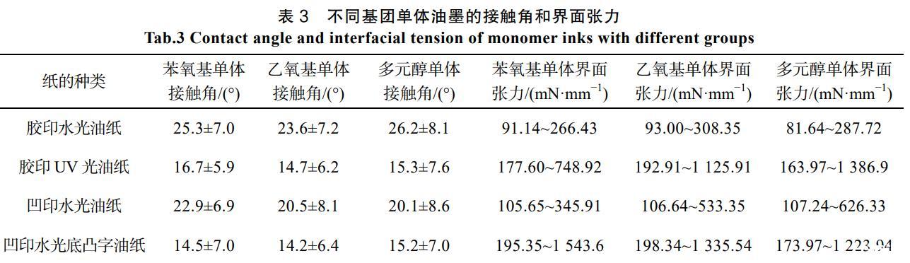 表3不同基團(tuán)單體油墨的接觸角和界面張力