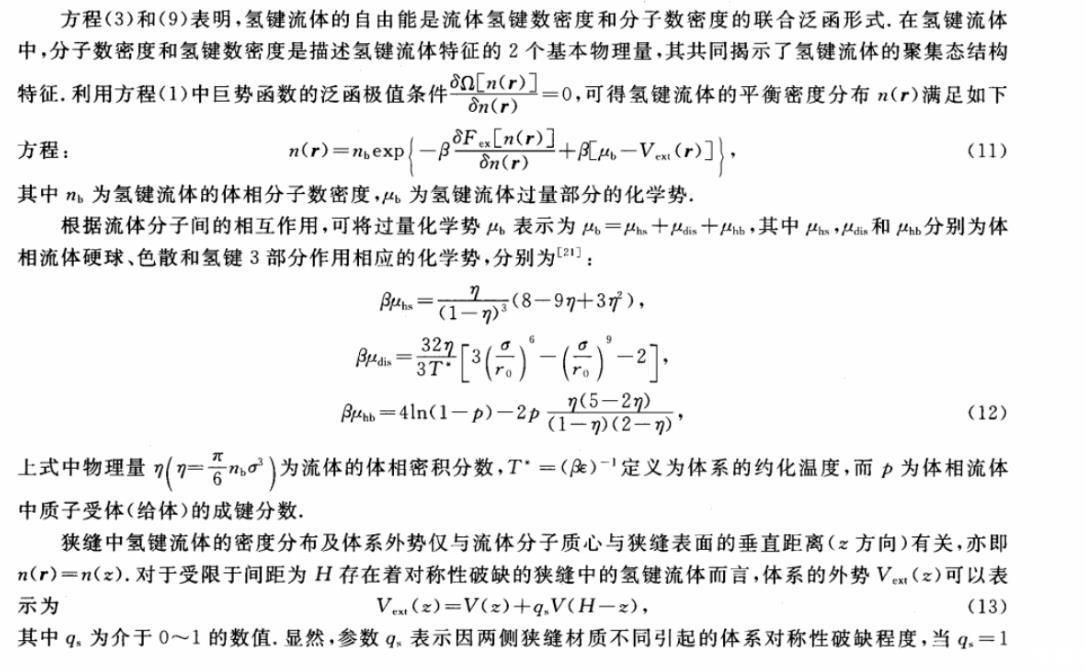 對處于給定外勢Vext(r)中且化學(xué)勢為μ的流體分子,經(jīng)典流體的密度泛函理論給出體系以局域密度n(r)為泛函變量的巨勢函數(shù)Ω[n(r)]形式如下:
