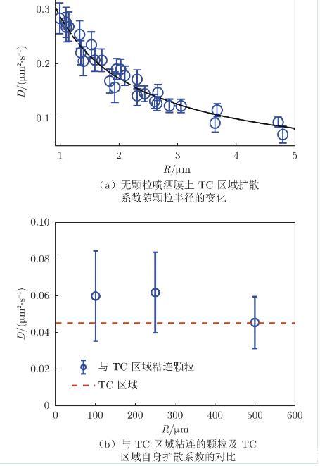 均為常數(shù),取自文獻(xiàn)。肺表面活性劑單層膜厚度為1 nm,由此可得膜的體黏度為0.77 Pa·s,是純水黏度的770倍。圖9(b)將與TC區(qū)域粘連的顆粒的擴(kuò)散系數(shù)(以圓形表示)與單獨(dú)TC區(qū)域的擴(kuò)散系數(shù)(以虛線表示)進(jìn)行了對(duì)比,后者選取3.5μm為平均TC區(qū)域直徑(參照?qǐng)D2照片),由HPW模型代入計(jì)算得出??梢钥闯?,在實(shí)驗(yàn)統(tǒng)計(jì)誤差范圍內(nèi),二者近似相等,表明顆粒與TC區(qū)域形成的整體受力主要來自于TC區(qū)域。TC區(qū)域直徑遠(yuǎn)大于顆粒直徑,膜內(nèi)黏滯阻力更大;此外,膜的體黏度遠(yuǎn)大于水相,因此水相對(duì)顆粒浸沒部分施加的黏滯阻力可忽略不計(jì)。