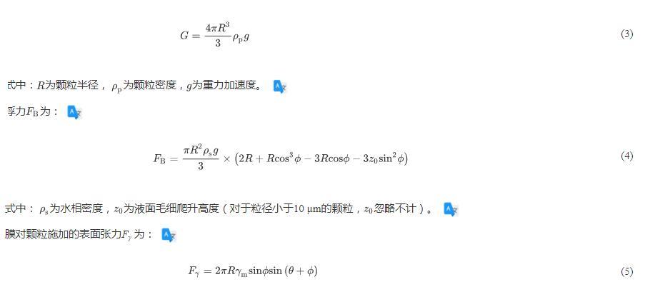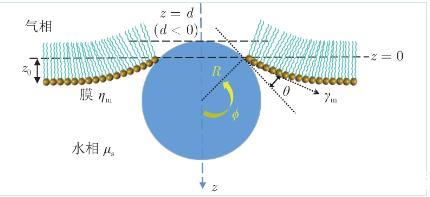 顆粒的水動(dòng)力學(xué)阻力系數(shù)取決于顆粒在水相中的浸沒程度(圖5,以顆粒暴露在空氣中的高度d表示)。顆粒的平衡位置取決于重力、浮力及膜施加的表面張力。重力G為: