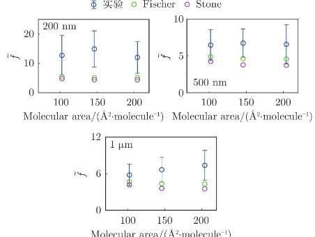 2)在LE相表面結(jié)構(gòu)均勻的膜上,顆粒阻力系數(shù)等于水動(dòng)力學(xué)阻力系數(shù)與熱力學(xué)毛細(xì)波界面擾動(dòng)表面張力阻力系數(shù)之和。其中,界面擾動(dòng)表面張力需體現(xiàn)膜的黏彈性及微納尺度,因此加入了黏彈性項(xiàng)以及熱力學(xué)毛細(xì)波波數(shù)項(xiàng)。利用熱力學(xué)毛細(xì)波波長擬合實(shí)驗(yàn)測(cè)量值發(fā)現(xiàn),約等于膜內(nèi)主要成分DPPC磷脂分子的平均間距,符合熱力學(xué)界面擾動(dòng)的理論描述。