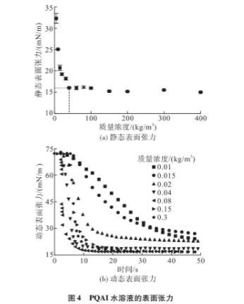 因此,本文采用芬蘭Kibron公司的表面張力儀在20一22℃下研究了溶液的界面性質(zhì),如靜態(tài)和動(dòng)態(tài)表面張力。不同PQAI溶液的靜態(tài)表面張力的變化如圖4(a)所示??梢钥闯?,在去離子水中加人少量表面活性劑,溶液的表面張力急劇下降。然而,在質(zhì)量濃度>0.04kg/m2時(shí),下降趨勢(shì)開(kāi)始緩慢。這意味著PQAI水溶液的pcMc~0.04kg/m2,此時(shí)表面活性劑水溶液靜態(tài)表面張力為16.07mN/m。