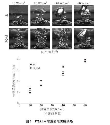 本文研究了PQAI溶液的池核沸騰換熱特性,試驗(yàn)臺(tái)參數(shù)參考文獻(xiàn)。圖5顯示了PQAI溶液在臨界膠束濃度下的沸騰傳熱性能。與水相比,由于PQAI水溶液中表面張力的降低,沸騰時(shí)產(chǎn)生的氣泡數(shù)量顯著增加,氣泡半徑減小。此外,在低熱流密度下,可以明顯觀察到在氣泡脫離時(shí)氣泡聚結(jié)的趨勢(shì)減小,并且氣泡的形狀更接近球形。表面活性劑分子由極性親水頭和疏水性長(zhǎng)尾組成。