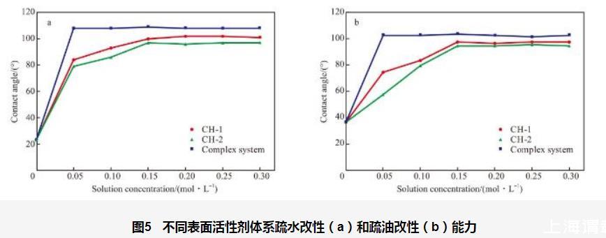 圖5不同表面活性劑體系疏水改性(a)和疏油改性(b)能力