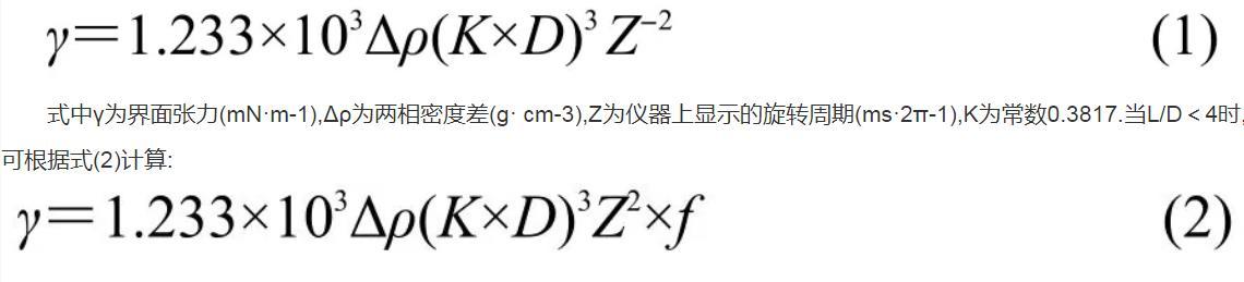 式中γ為界面張力(mN·m-1),Δρ為兩相密度差(g·cm-3),Z為儀器上顯示的旋轉(zhuǎn)周期(ms·2π-1),K為常數(shù)0.3817.當(dāng)L/D<4時(shí),可根據(jù)式(2)計(jì)算: