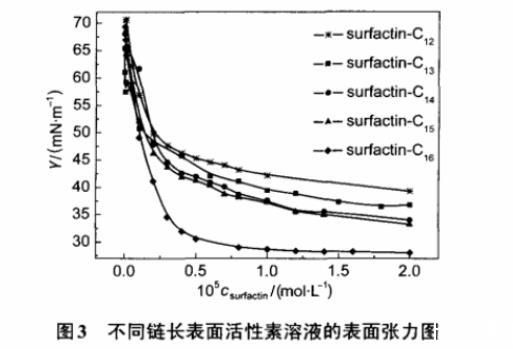 圖3不同鏈長(zhǎng)表面活性素溶液的表面張力圖
